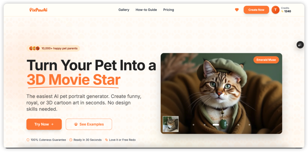 PixPawAI offers 12+ distinct styles with a focus on artistic, stylized portraits—not 3D cartoons or generic filters. Their AI generates portraits in about 30 seconds, and pricing is straightforward: